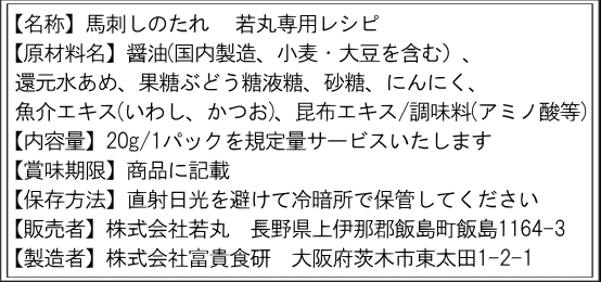 | 馬刺し専用タレ | ![]() ■当店オリジナルタレを規定量サービスします。別途ご希望の方はこちらでお買い求め下さい。 |